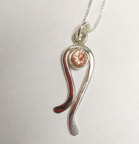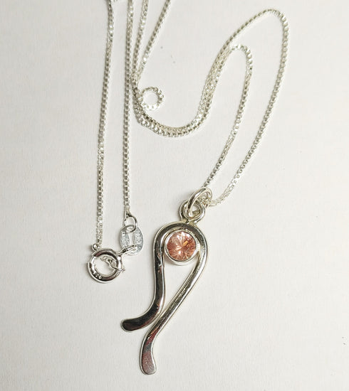 Hand forged in solid Sterling Silver; this pendant is set with a 5mm round light peach Oregon Sunstone which is about .50 carats. The necklace is approximately 2 inches long and includes an 18" box chain.