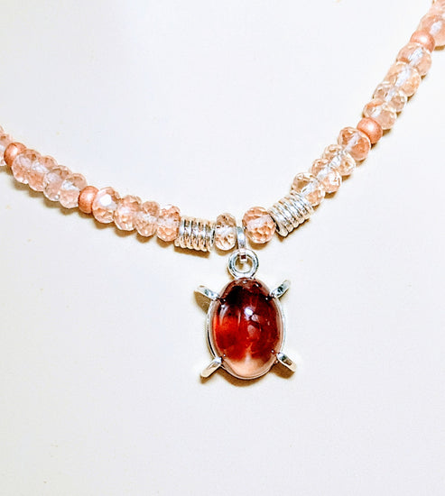 This necklace is a statement piece combining a single large oval Cabochon Sunstone as the centerpiece along with 38 faceted Sunstone beads.
