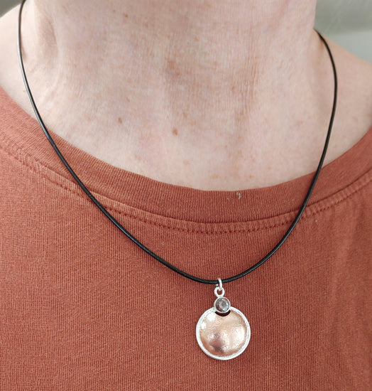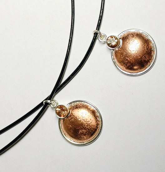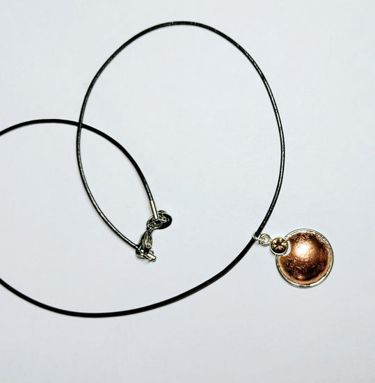 "Copper-Silvermoon Necklace" on black leather cord.