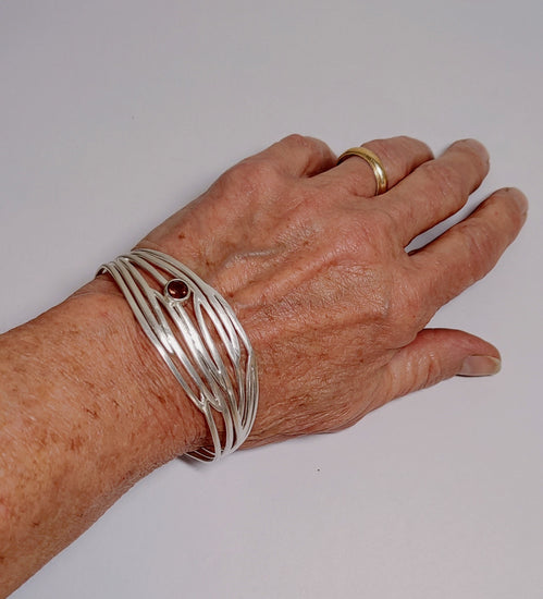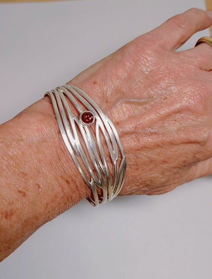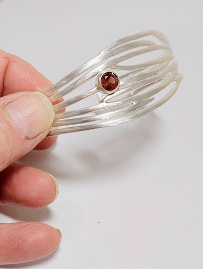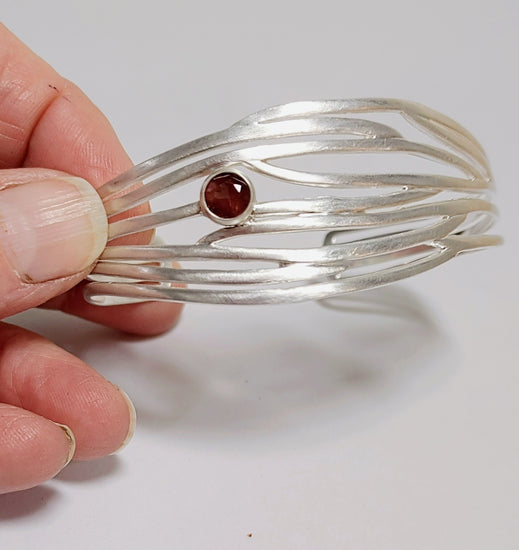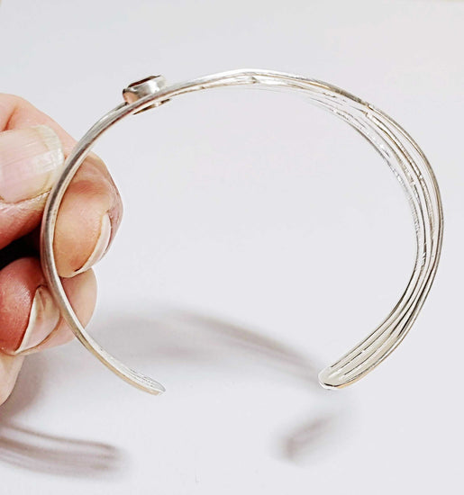 This artistically designed bracelet has an open pattern, creating a serene ebb & flow. The width is about 1 inch, tapering to 3/8s inch in the back. It is made to fit an average medium size wrist.