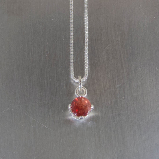 Each Oregon Sunstone Solitaire Pendant is made of solid Sterling Silver, features a 6 to 6.5mm Oregon Sunstone, approximately 1.00 carats. This classic necklace is styled with a 4-prong basket and comes on either a 16" or 18" sterling silver box chain.